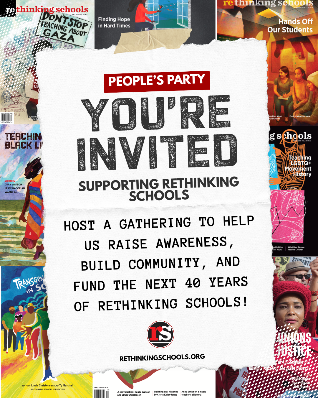We created this toolkit to support your experience hosting a house party for Rethinking Schools. In it, you’ll find an overview of RS, an overview of house parties, steps to plan your house party, and information on how to request materials for your party.