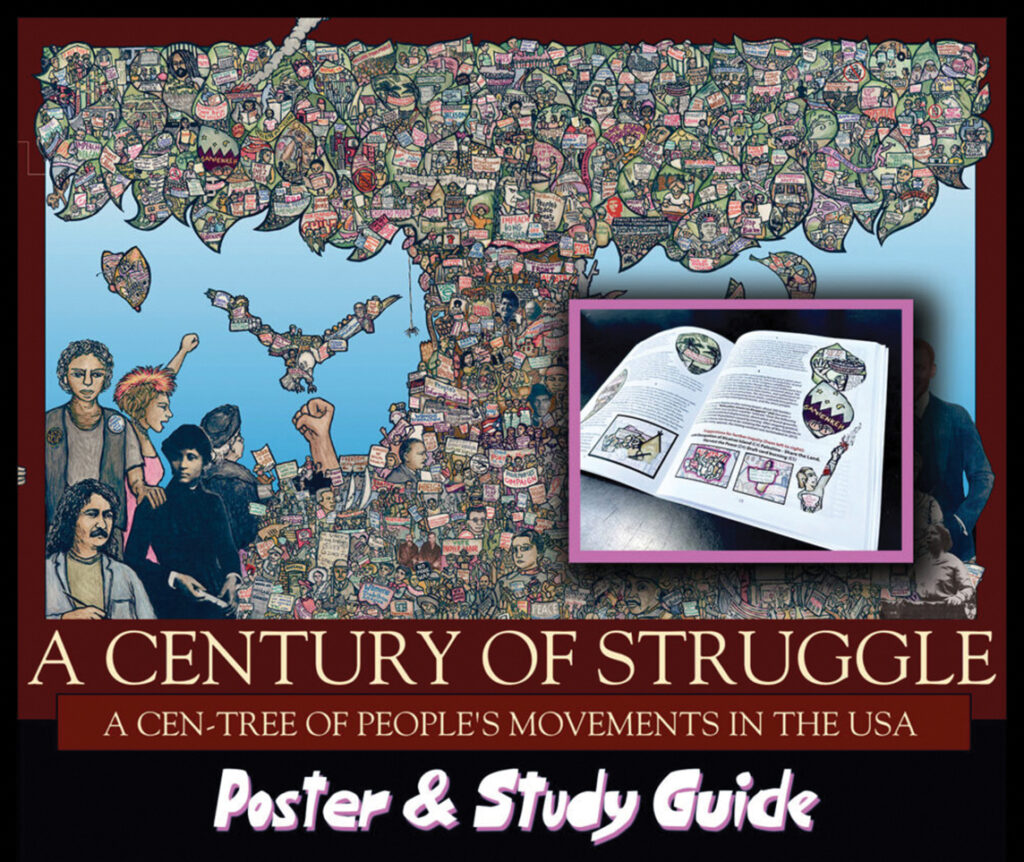 Ricardo Levins Morales and Janna Schneider’s remarkable and classroom-friendly “Century of Struggle” poster was originally published by the Northland Poster Collective in 2000. It is a “Cen-tree” collage featuring more than 700 illustrations celebrating the history of 20th-century U.S. social movements. The new guide to the poster offers a few reflection questions, but mostly, it helps locate and identify individuals and movements included. The guide is organized into 10 sections: Cultural Work, Right to Remain, Gay Liberation, Faces of Struggle, Electoral Activism, Strikes, Rural Organizing, Political Prisoners, the ’76 Bicentennial, and Anti-Globalization. Each entry — e.g., the AIDS Quilt, the International Hotel struggle, Wounded Knee, ACT UP, Lucy Parsons, Septima Clark, Mississippi Freedom Democratic Party, the Seattle Ladies Tailor Strike, the Harlem Tenants Strike, Southern Tenant Farmers Union, Black Panther Party, and the “Battle of Seattle” — gets coordinates on the locator grid to help students and teachers identify individuals, movements, and events. Great for art or history classes, or for anyone who wants to be reminded about the magnificent people’s history of the 20th century.