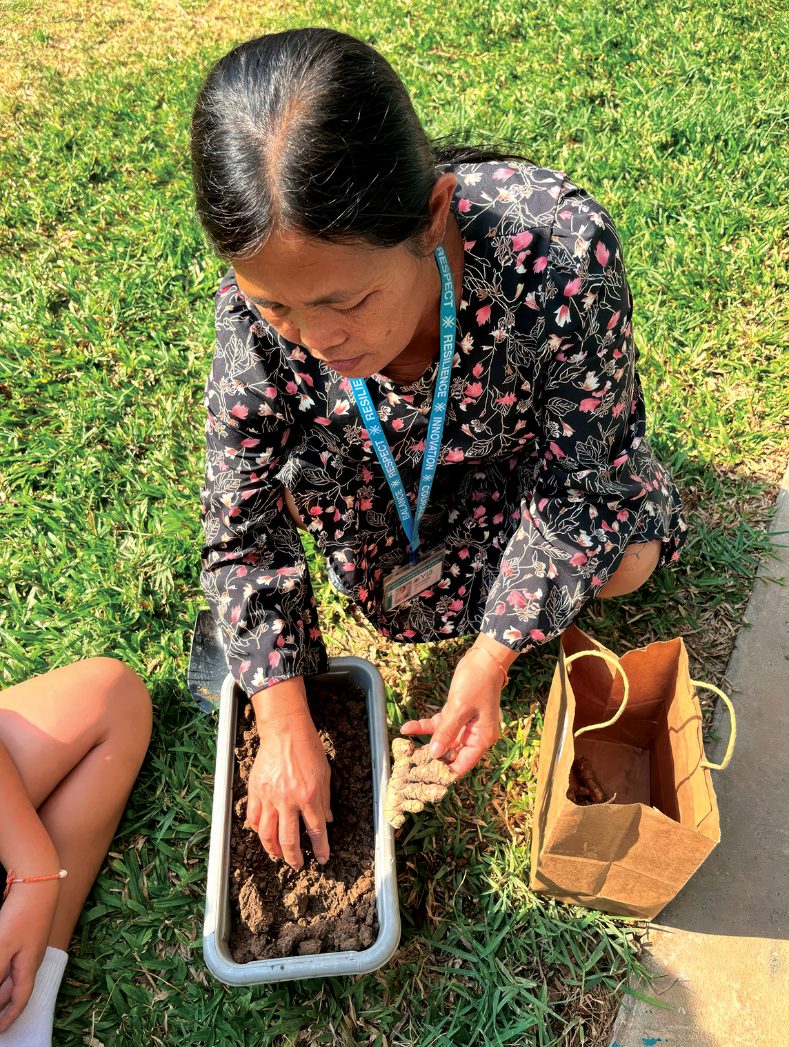 Back at school, we planted the seeds and roots we had bought. Vanmany, in her soft-spoken way, showed us what to do. The students watched her break up the soil and mix it with manure. Some students jumped right in, starting to dig, and said that they had gardens at home. But it was clear that most students had never gardened before or spent much time outside of cities.