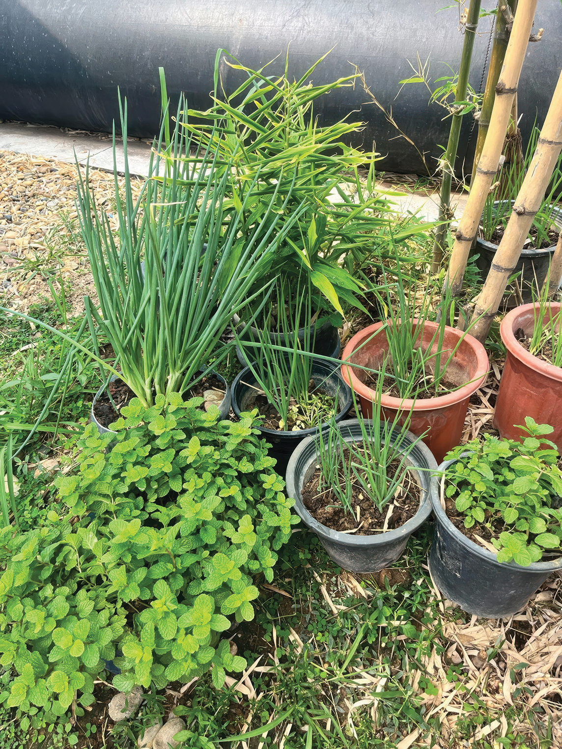 Then she took me to a spot behind the canteen. There were small pots with all sorts of herbs growing — mint, basil, lemongrass.
